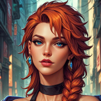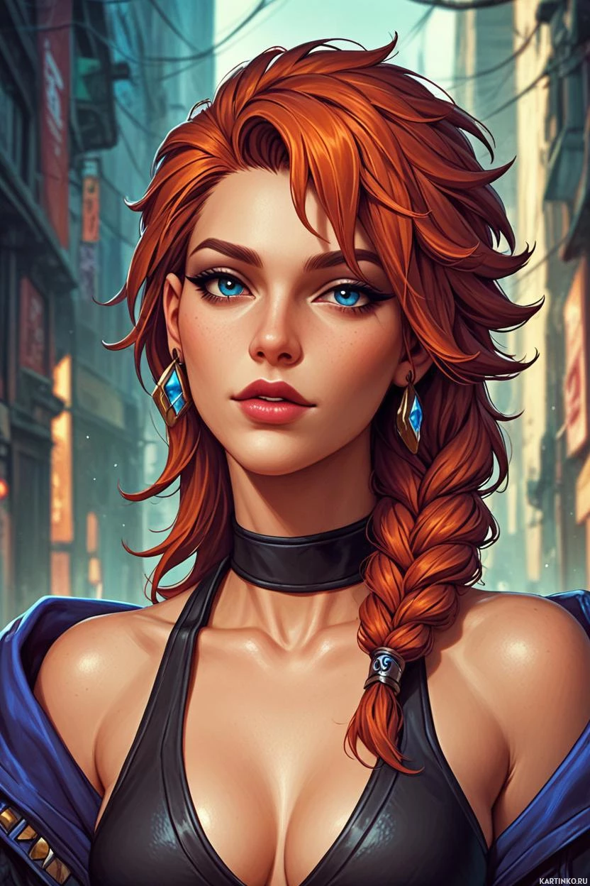 a young woman with striking red hair styled in braids that fall over her shoulders. She has large