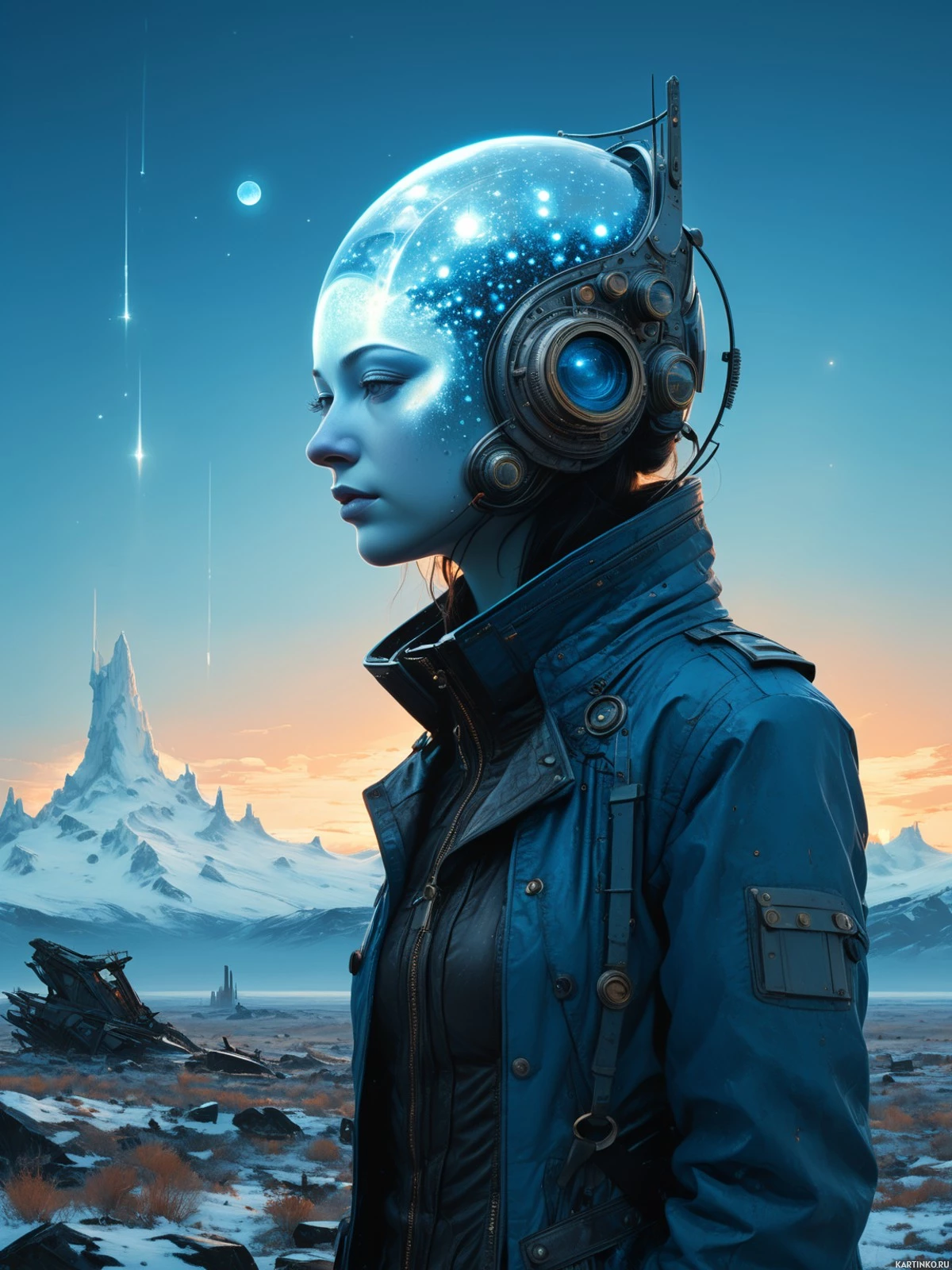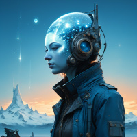 the warm tones contrasted against the cool blues of the environment. This image is commonly associated with science fiction genres, often depicting futuristic characters or scenarios that explore themes related to humanity's relationship with technology and its potential for enhancement or transformation.