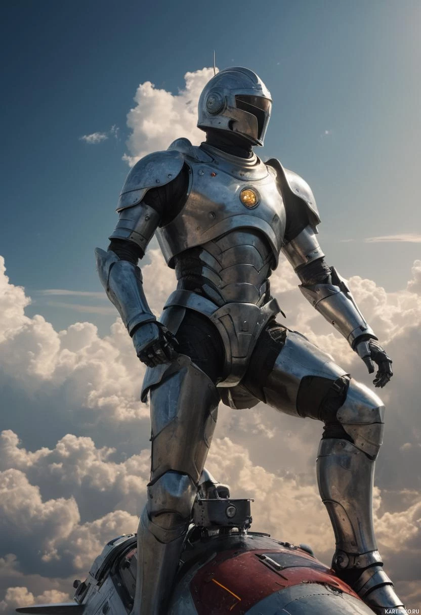 armored suit is predominantly silver with certain areas appearing to be black or darker, possibly indicating flexible joints or paneling. The helmet features a visor that has a red glow emanating from the eyes and mouth area, suggesting the presence of digital interfaces or
