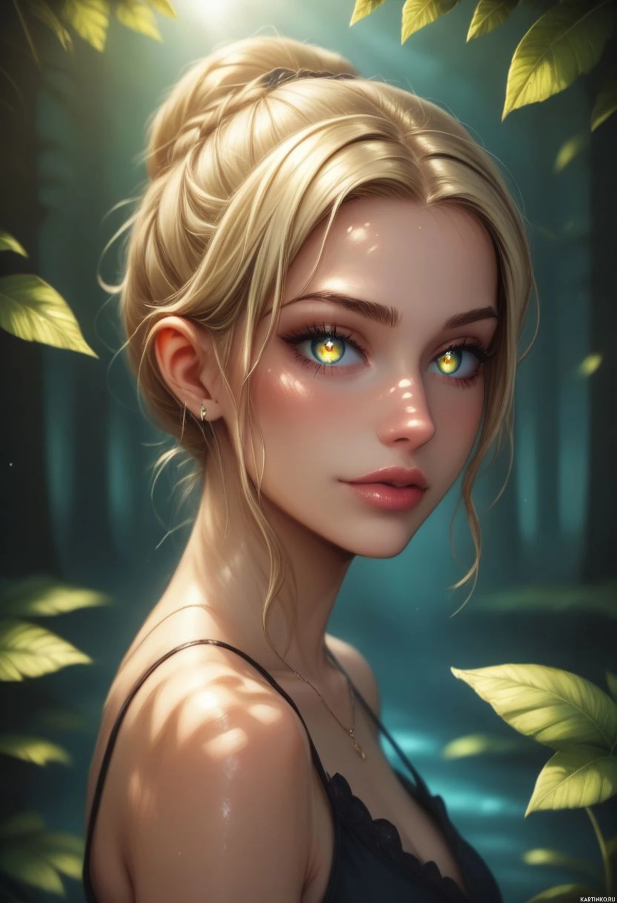 rosy cheeks and lips, giving her a soft, ethereal appearance. The background suggests