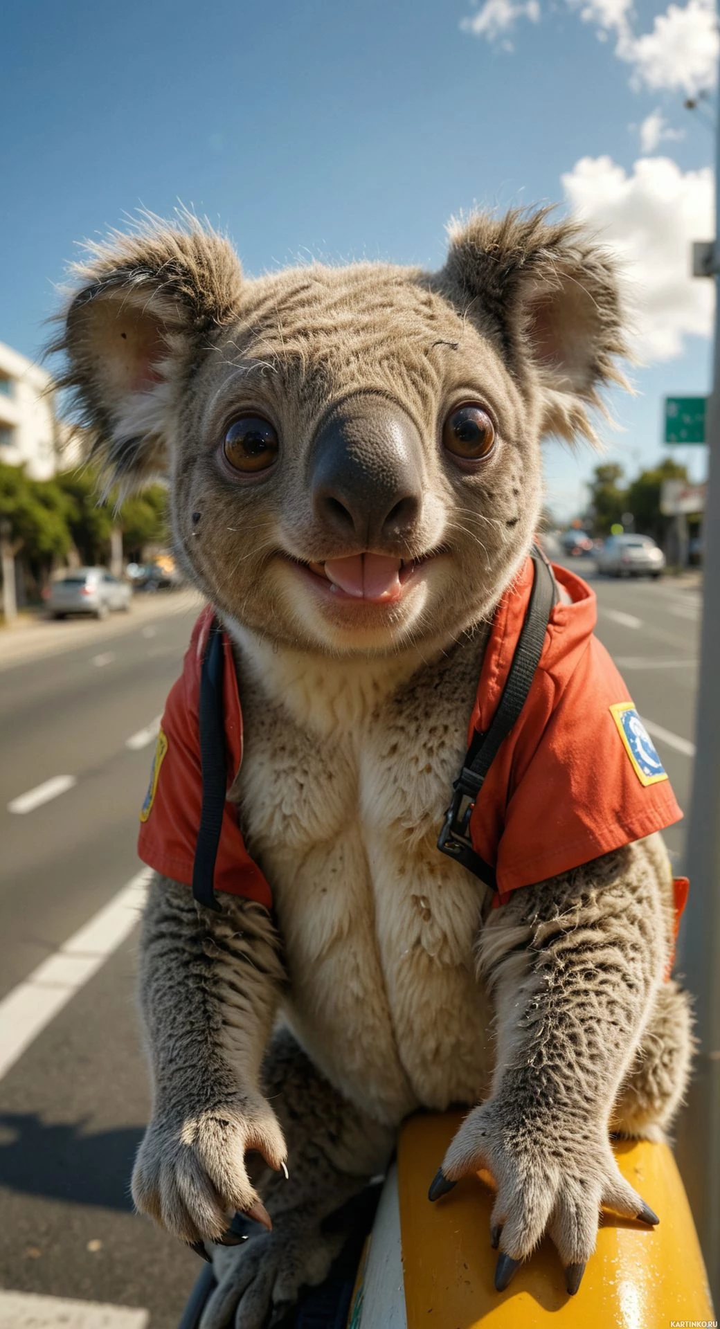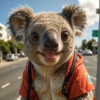 an animal costume that resembles a koala. The individual is standing and appears to be interacting with their environment, possibly at