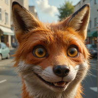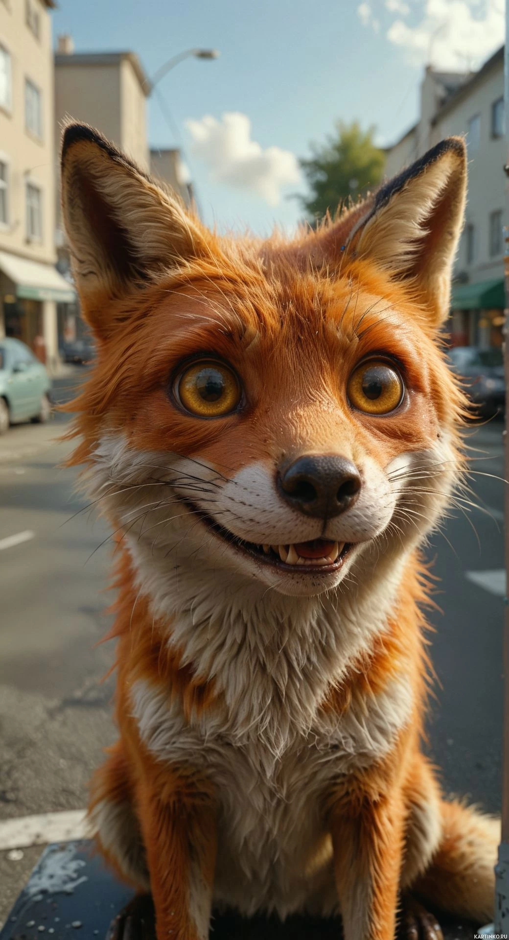 a joyful expression. This creature's characteristics are not typical of real foxes but rather suggest it could be a character or creation for entertainment or