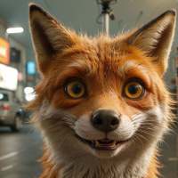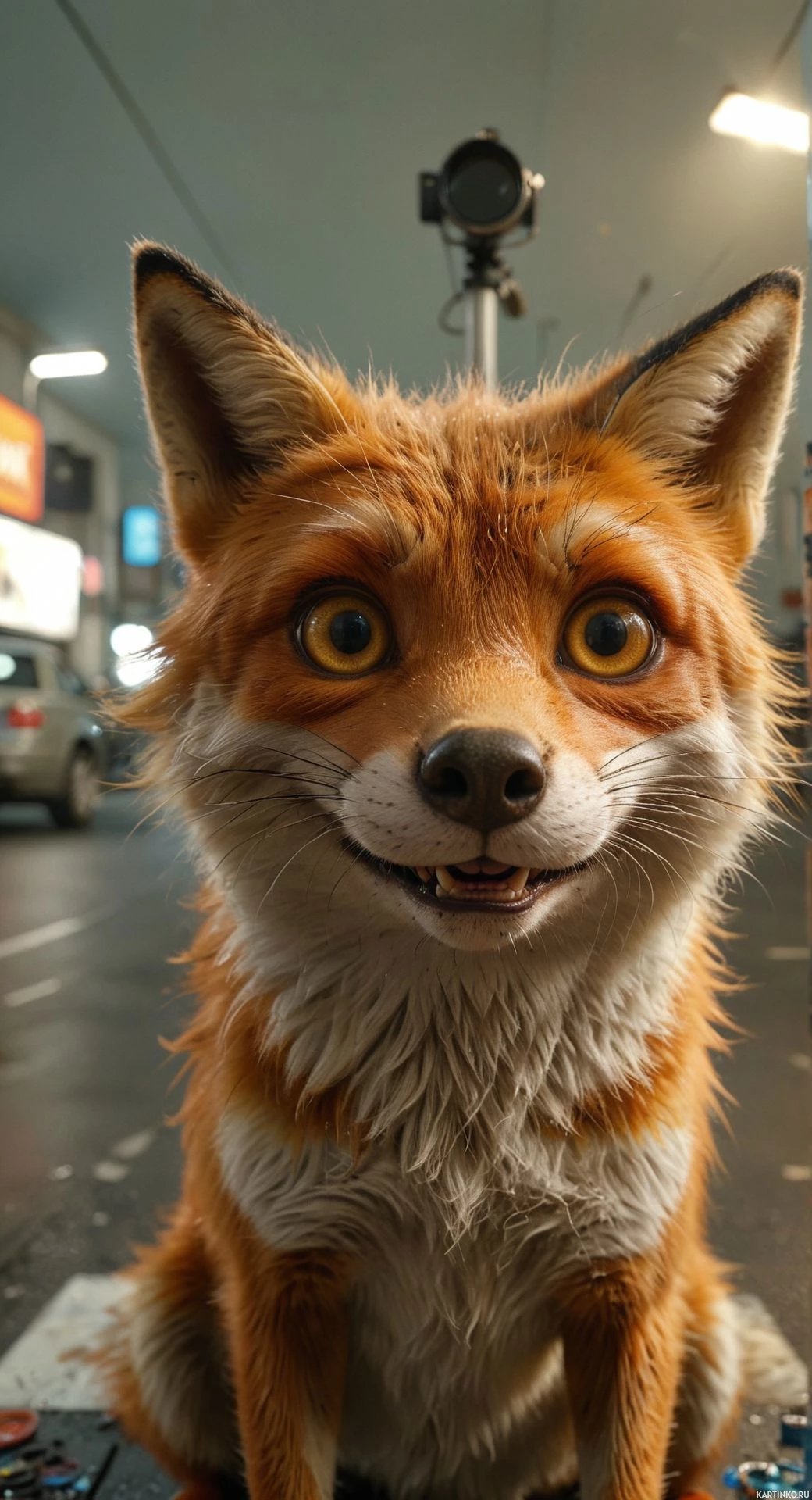 The image features a fox, which is an animal. It appears to be sitting on a street, likely