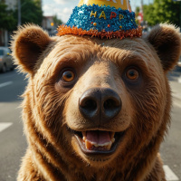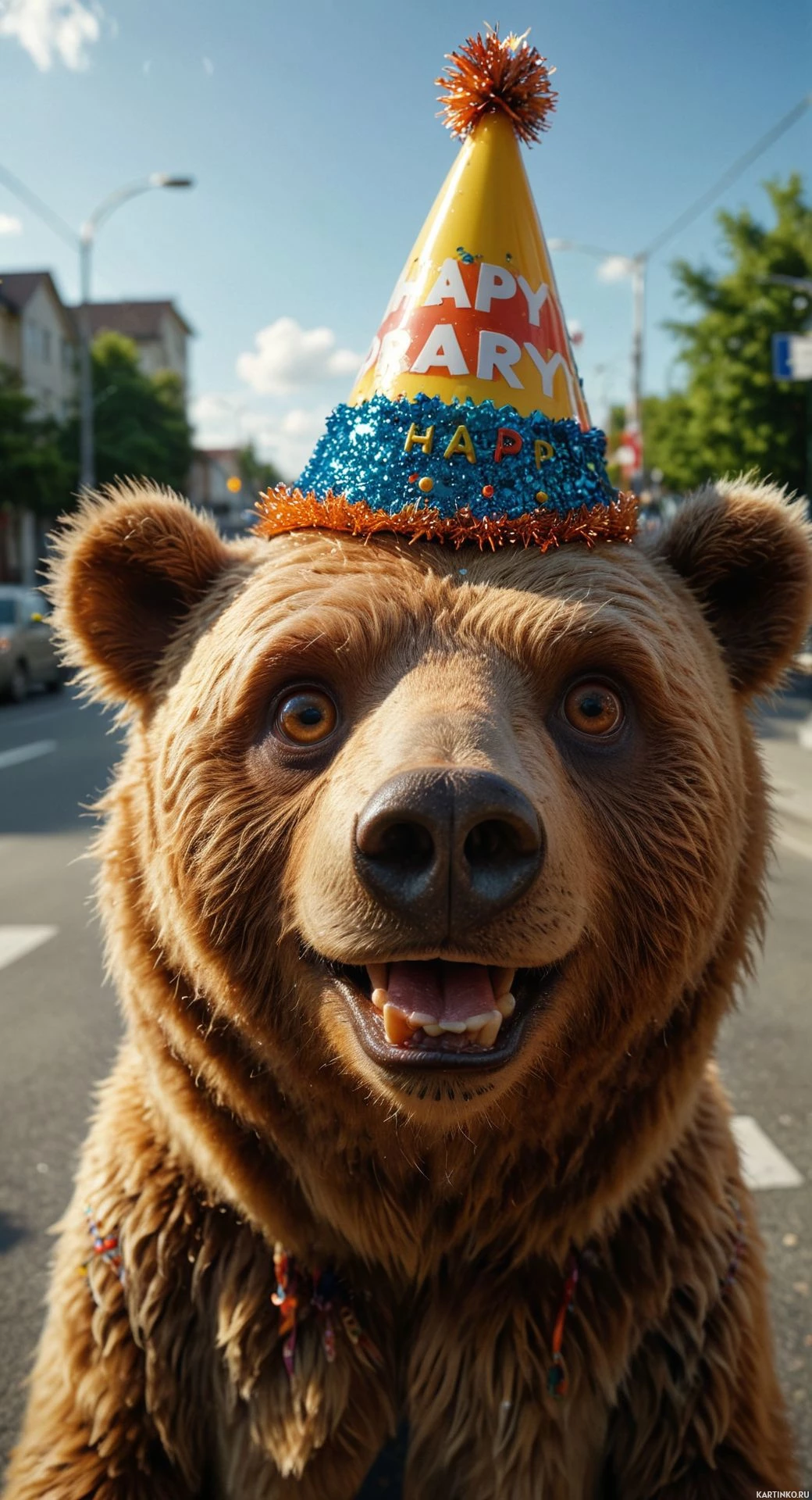 teddy bear-like costume that resembles a brown bear. It has a friendly appearance with its mouth slightly open as if it's smiling or panting, and it's wearing a festive birthday