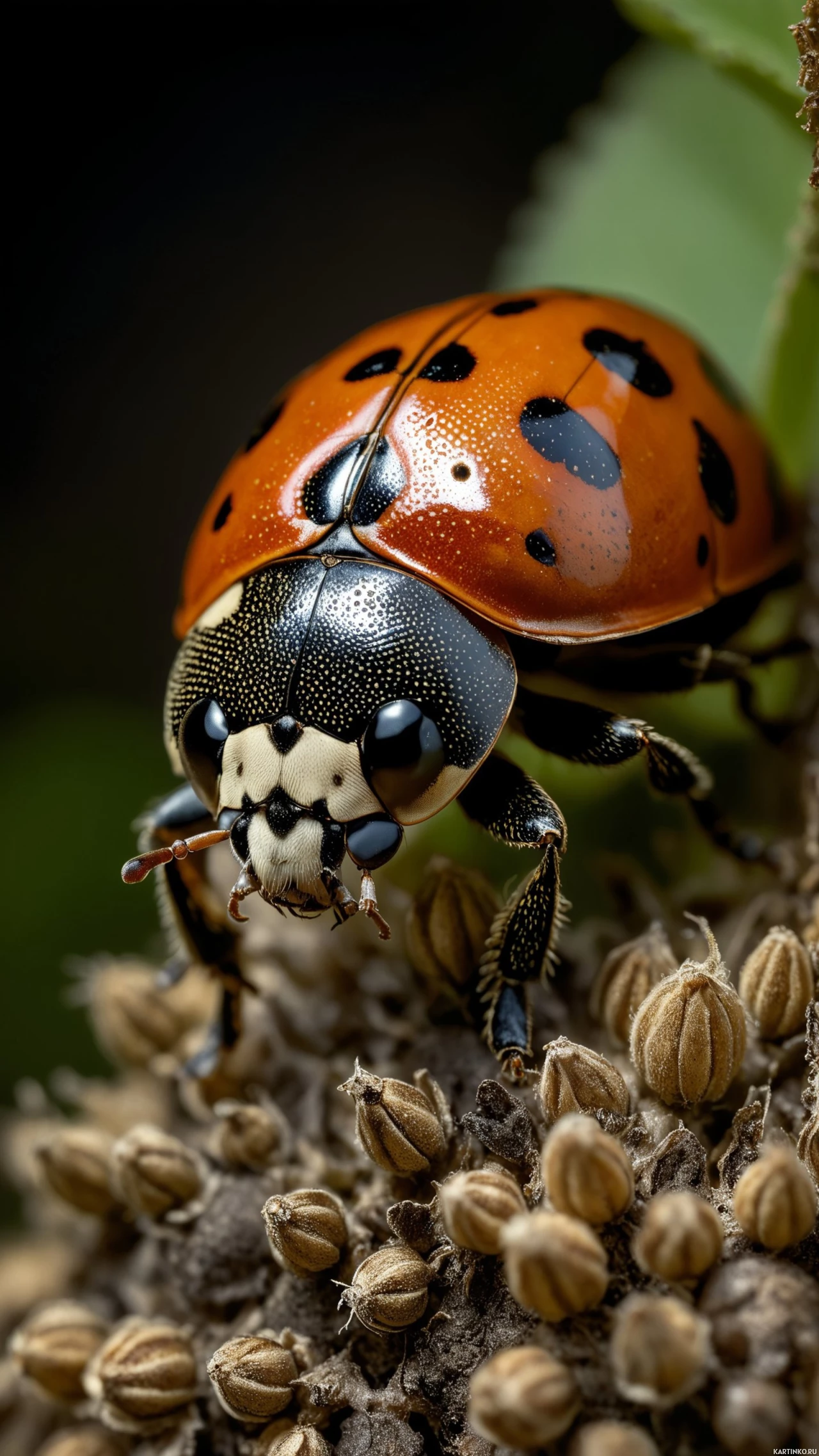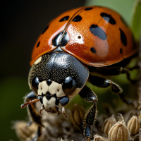 red ladybug with black spots and antennae, standing on what appears to be the surface of a plant. The ladybug is positioned in such a way that it is facing towards the camera, giving us a clear view of its