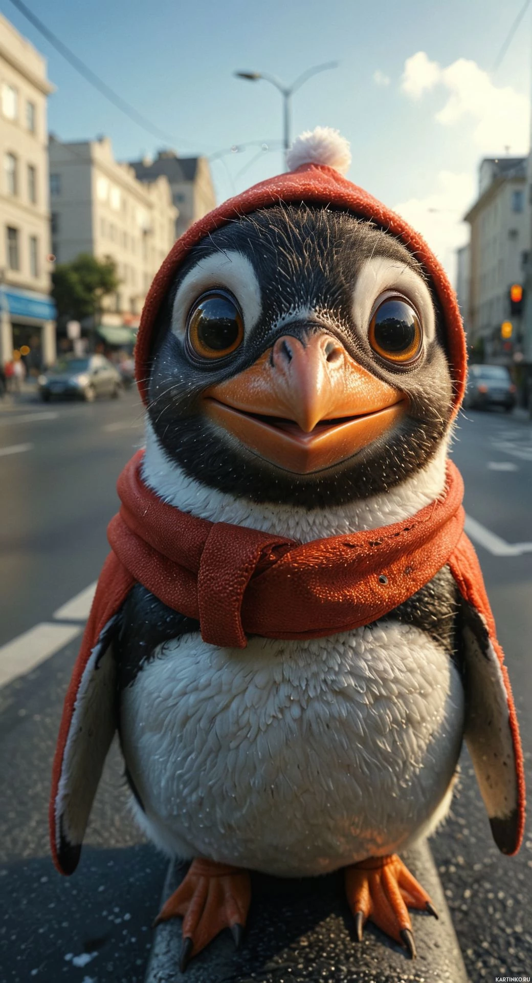 In the image, there is a penguin standing on what appears to be a street or sidewalk. The penguin has been creatively dressed to resemble a character wearing