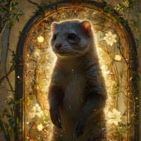 tale setting with branches and leaves filling the top part of the image, and there are white flowers and greenery adorning the bottom left corner. Above the ferret's head, there's