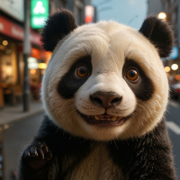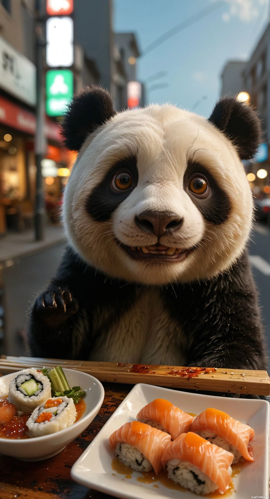 an outdoor table. The panda is smiling and appears to be enjoying a meal consisting of sushi and possibly some vegetables on the side. There are also other people visible in the background, suggesting that this might be