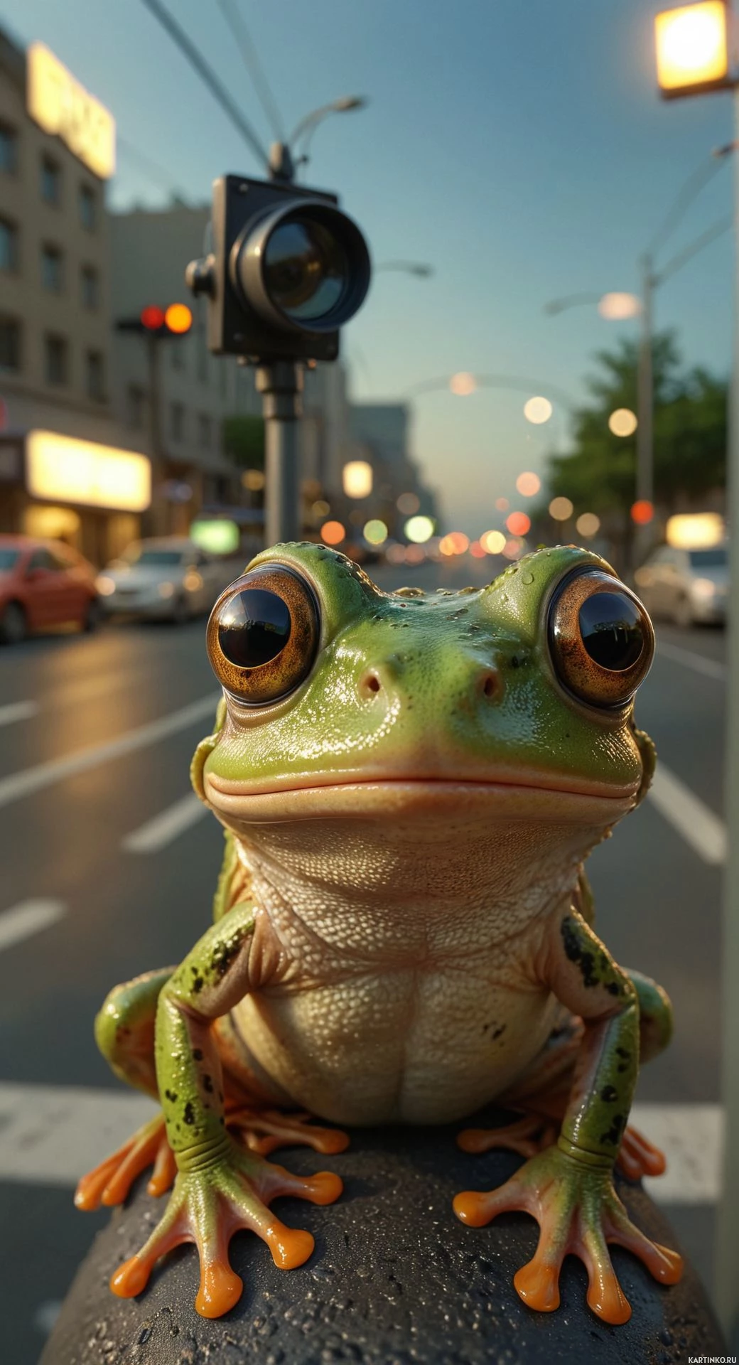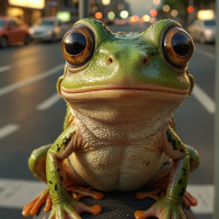 dimensional model or sculpture of a frog, positioned as if it were sitting on a ledge or barrier. The frog appears to be detailed and lifelike, with prominent features such as its eyes, nose, mouth, and skin texture. In the background, there are elements suggestive of an urban