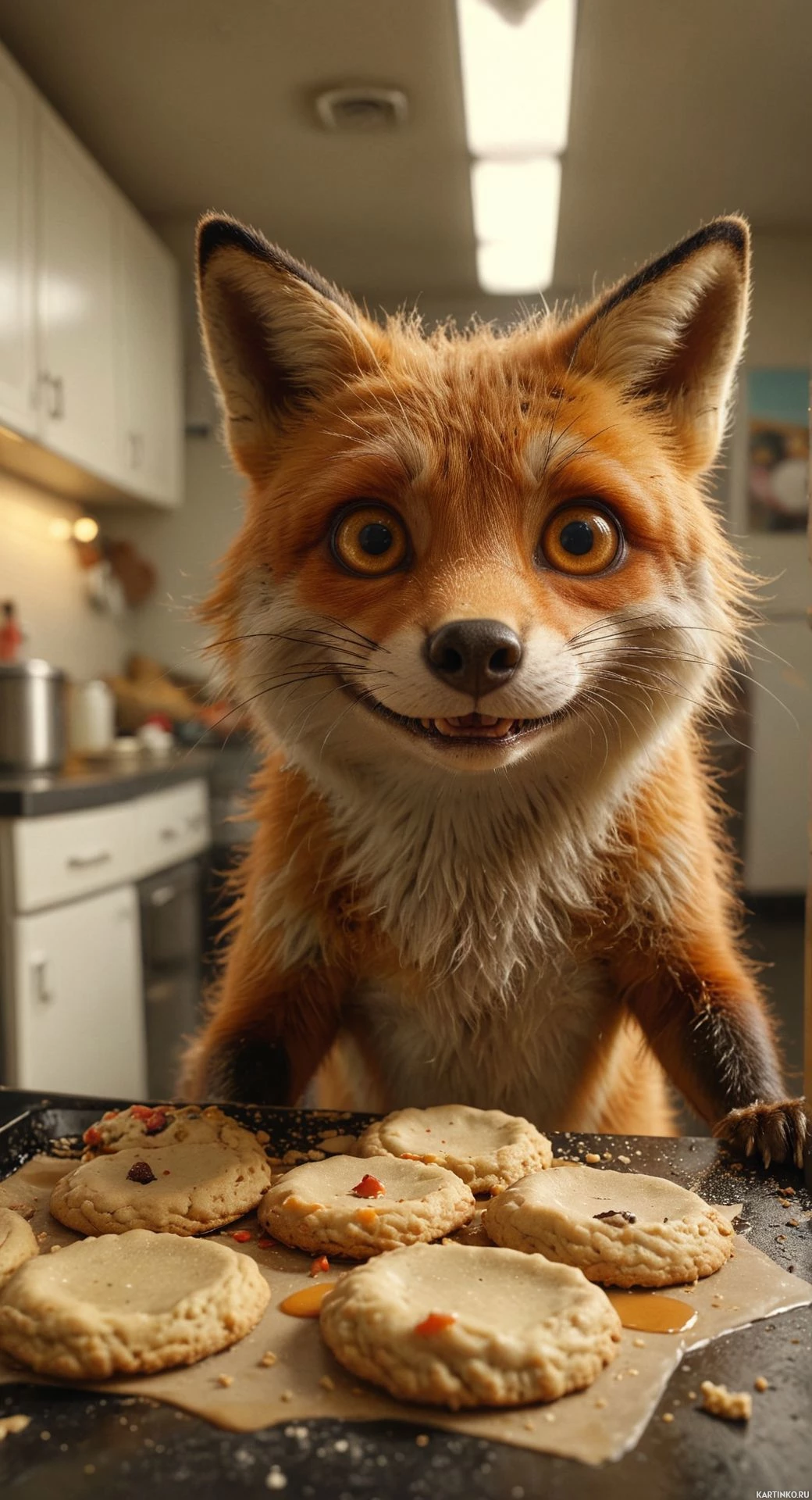 The image shows a fox, which appears to be anthropomorphized with human-like features. It is sitting at a table and seems to be engaged in an activity that resembles baking or preparing food, as there are