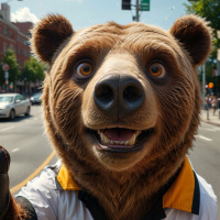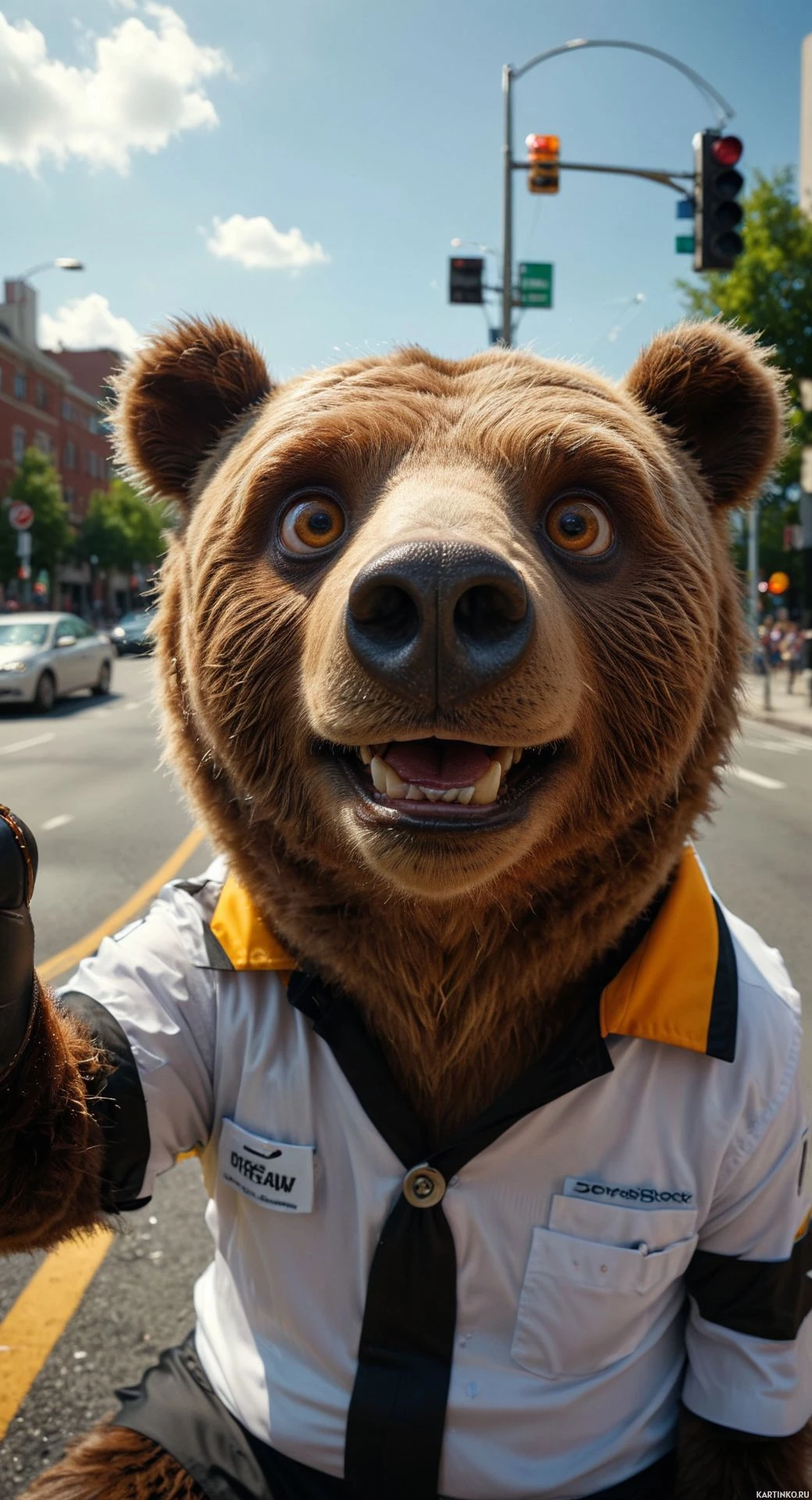 furry body with a visible snout and eyes that resemble those of a real bear. The character is wearing an attire that appears to be inspired by the uniforms worn by traffic officers or construction workers, which are often yellow and white in color, with reflective stripes and