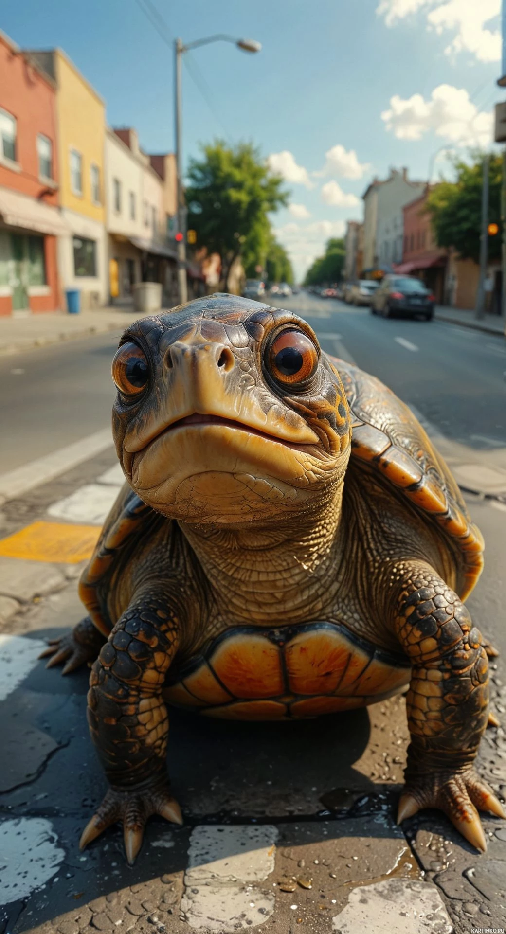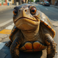 a realistic design with visible shell patterns, eyes, mouth, and limbs. It is situated outdoors on