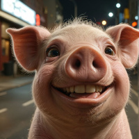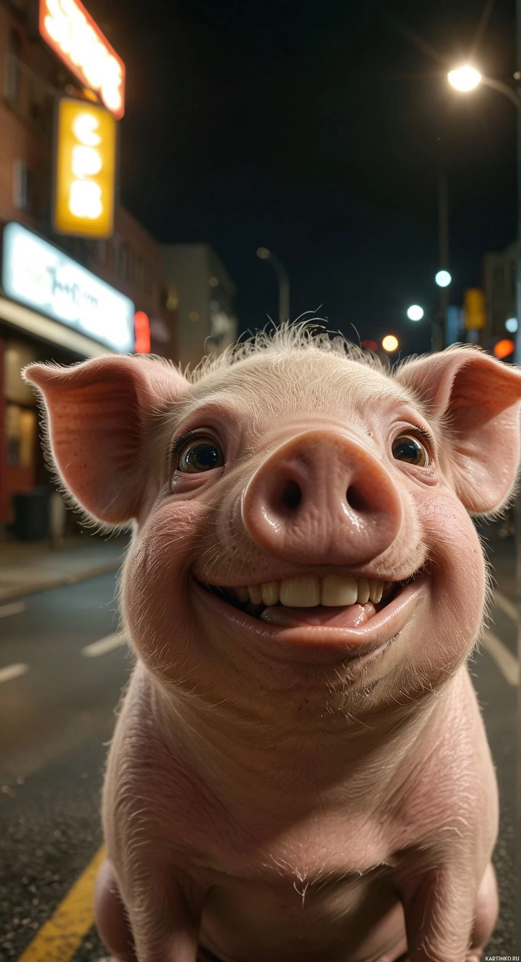 street lamps in the background, suggesting it might be taken at night or during early evening hours. The pig is looking directly at the camera, giving the impression of a happy or amused expression.