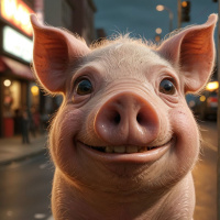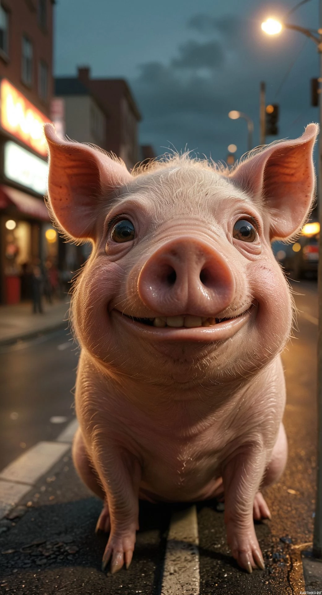a cheerful expression and is looking directly at the camera with its mouth open in a smile. Its ears are perked up, indicating alertness. There is a traffic light visible behind the pig, suggesting it might be a city or