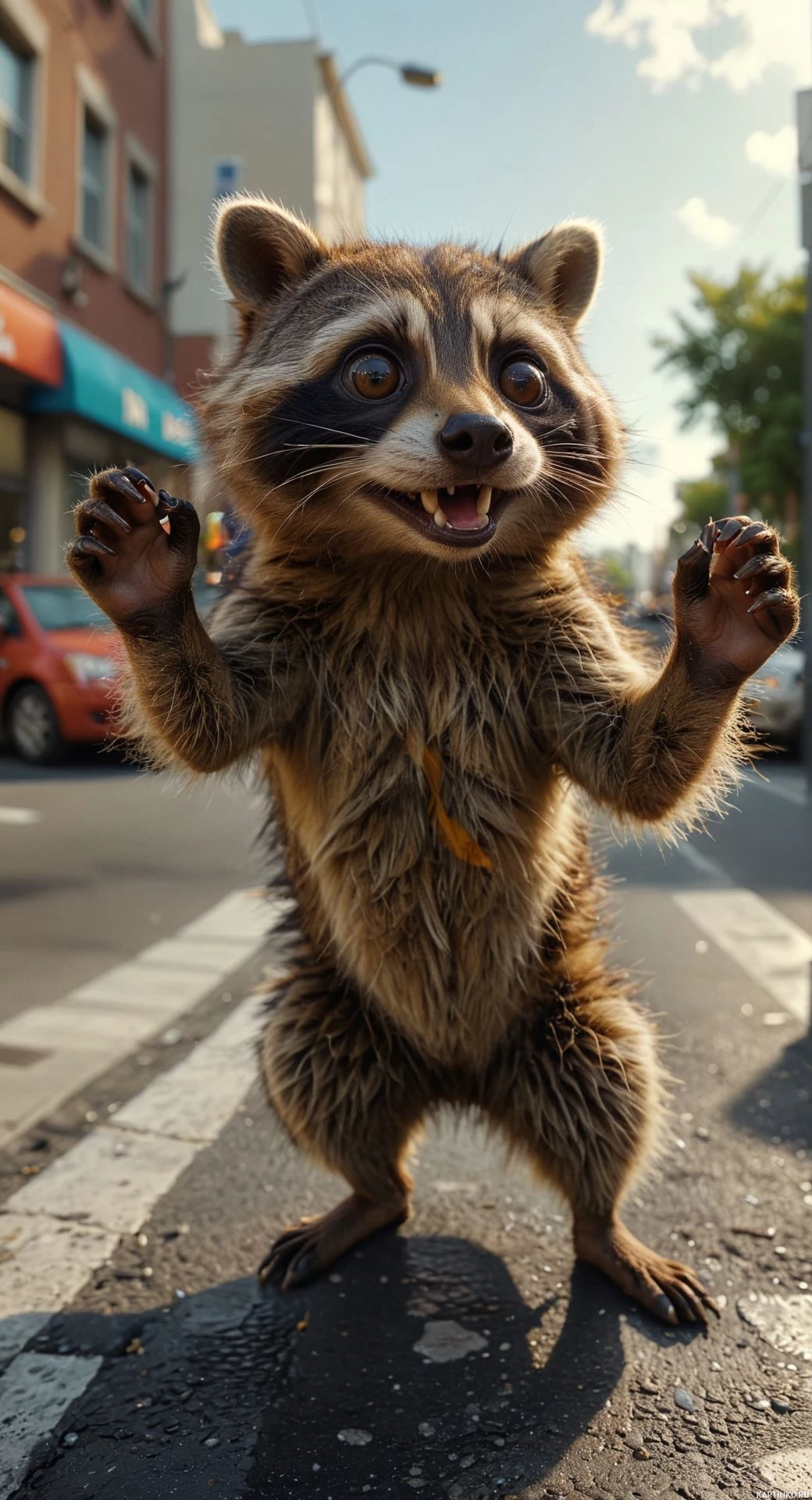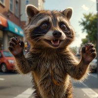 an urban environment, likely on a street. The costume is detailed with fur and features that are characteristic of a raccoon's appearance. The character has its arms raised and is smiling broadly. In the background, there are buildings, trees, and vehicles, suggesting it might be