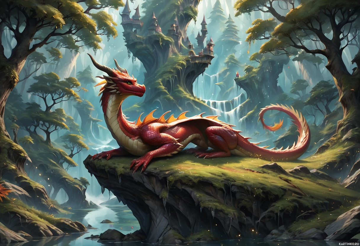 a rocky outcropping with its wings spread wide, showcasing intricate scales and spines. In the background, there is a lush landscape with verdant trees, sparkling waterfalls cascading down from the top of a cliff into a clear