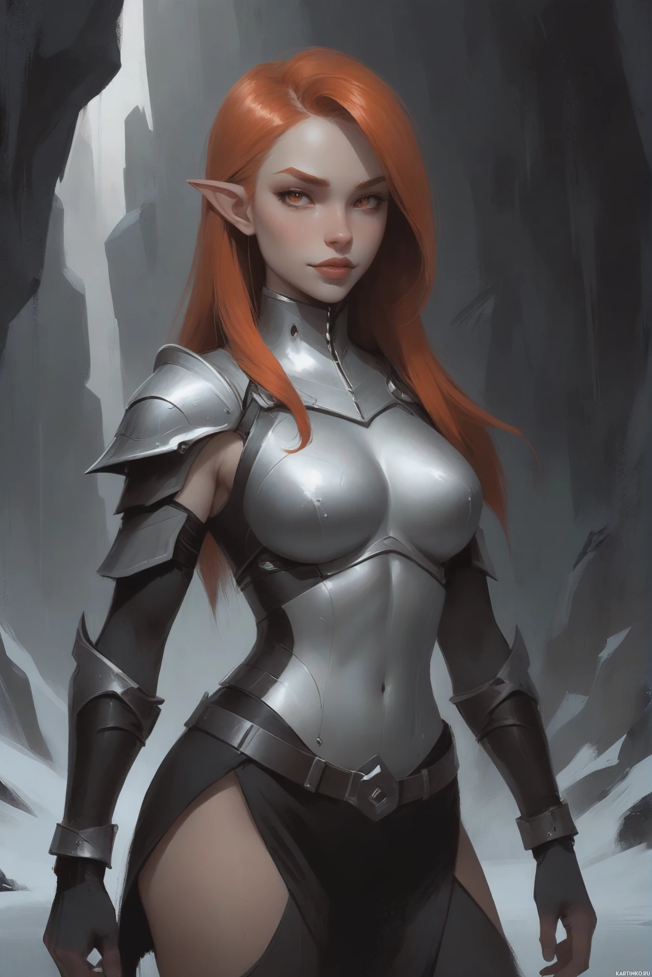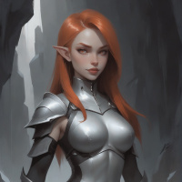 red hair. She is adorned in armor that appears to be of a fantasy or medieval design, suggesting she may be portraying an elf character from