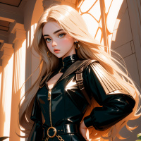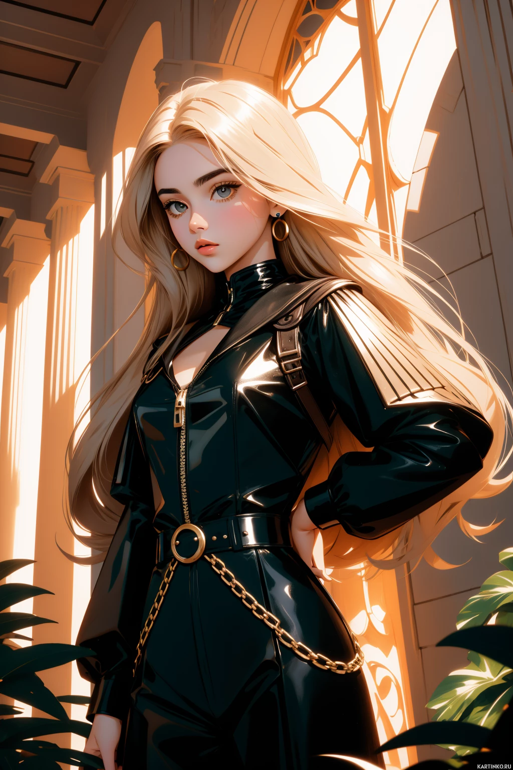 leather clothing that appears to be a uniform or suit, complete with straps and buckles at the chest and waist areas. Her pose is confident and self-assured, with one hand resting on her hip while she looks directly at the viewer with