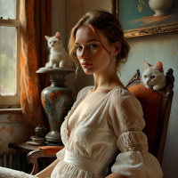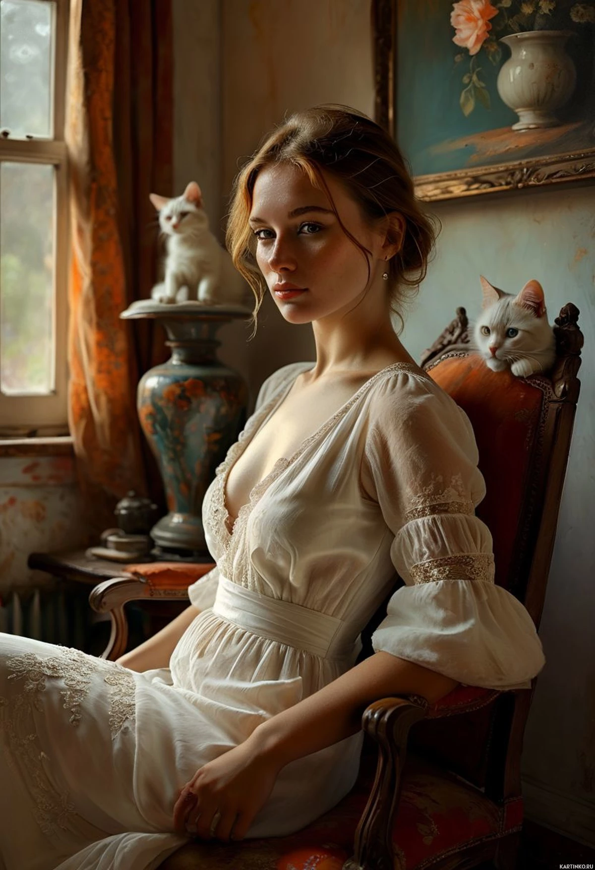 elegant dress with a lace neckline and her hair is styled in an updo with loose strands hanging around her shoulders. In front of her, two cats are perched atop what appears to be an ornate vase or sculpture, adding