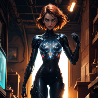 a female character with red hair, standing within an industrial setting that appears to be a science fiction scene. She is wearing a sleek black and blue bodysuit that suggests a high-tech or cybernetic design, with glowing circuitry elements visible on her armor. The character is holding what looks like