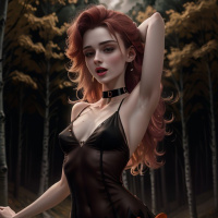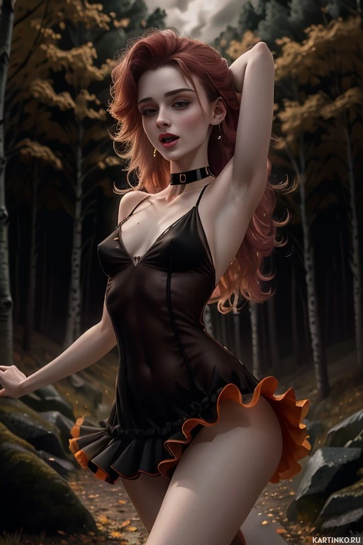 black lingerie with orange accents and leather elements, giving it a gothic or fetishistic style. Her pose suggests she might be dancing, as her left arm is raised and bent at the elbow while her right hand rests on her hip. The forest around her is dark and dense, with