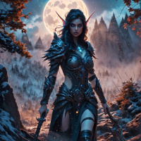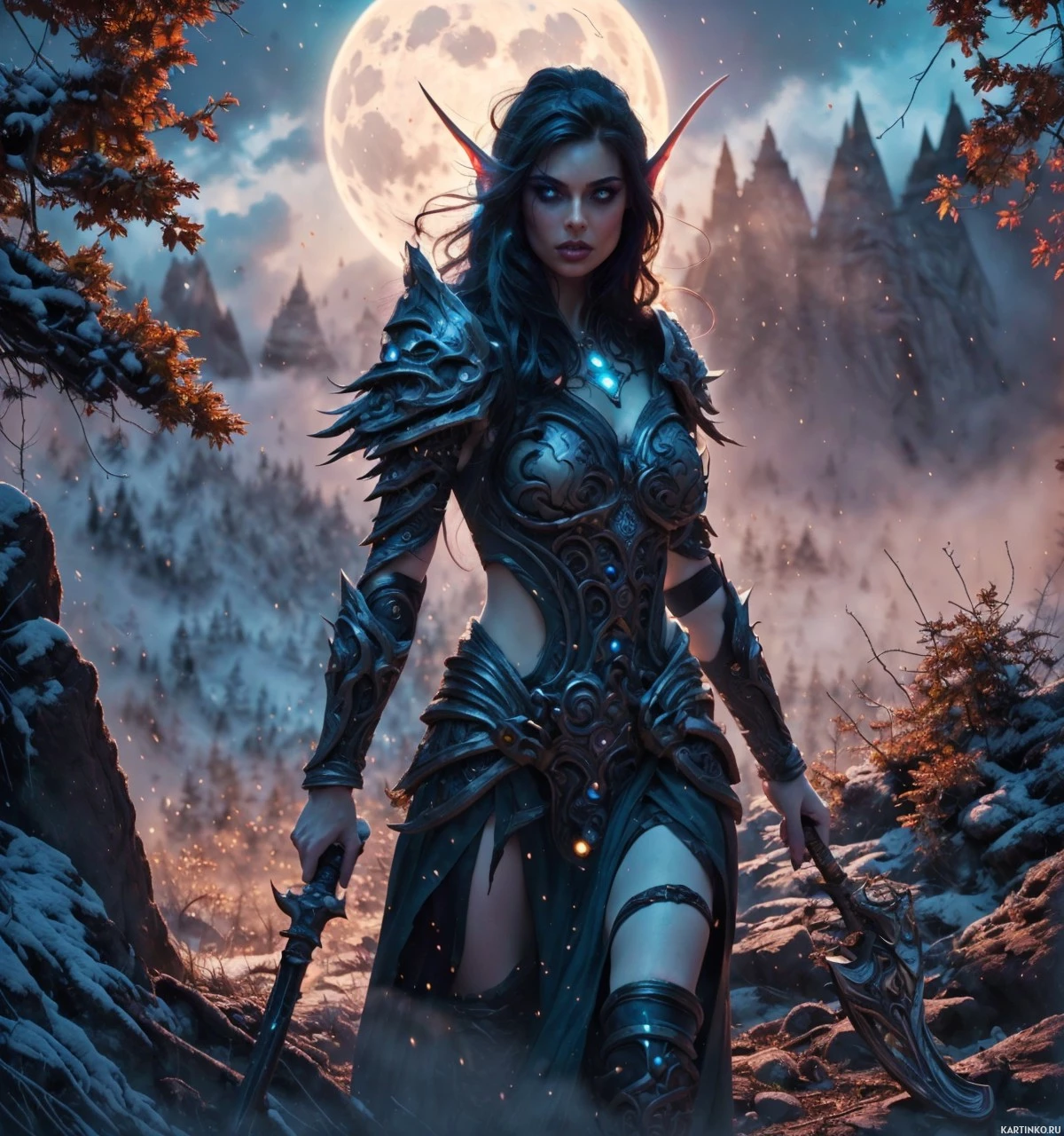 the armor set for enhanced protection in combat situations. She is holding a long sword in her right hand, which is poised as if ready to strike or defend. The sword's design complements the fantasy theme, with ornate details and a style that suggests it could be magical or of great importance within her context. The setting appears to be a cold, possibly winter environment, indicated by the snow-covered ground and trees in the background. The moon is visible high in the sky, casting a soft glow on the scene and adding a mystical atmosphere to the image. This suggests that it could be evening or nighttime, which adds to the fantastical ambiance of the artwork. Overall, this piece of digital art captures the essence of fantasy through its depiction of an elven warrior under a moonlit sky in a chilly landscape.