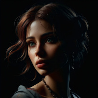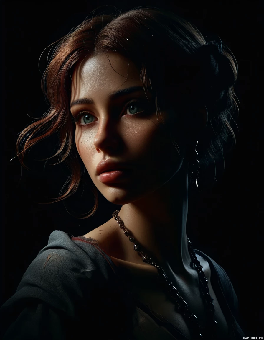 pink lipstick that complements the natural tones of her skin. The woman wears what appears to be a historical or fantasy-inspired outfit, consisting of a garment with an intricate lace detail at the neckline and a chain around her collar. There is also a hint of