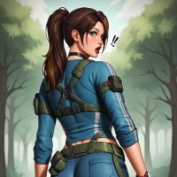 utility belts or pouches on either side of her hips. Her expression is serious, and she seems to be looking off into the distance. The setting appears to be a serene forest environment, with trees visible in the background under