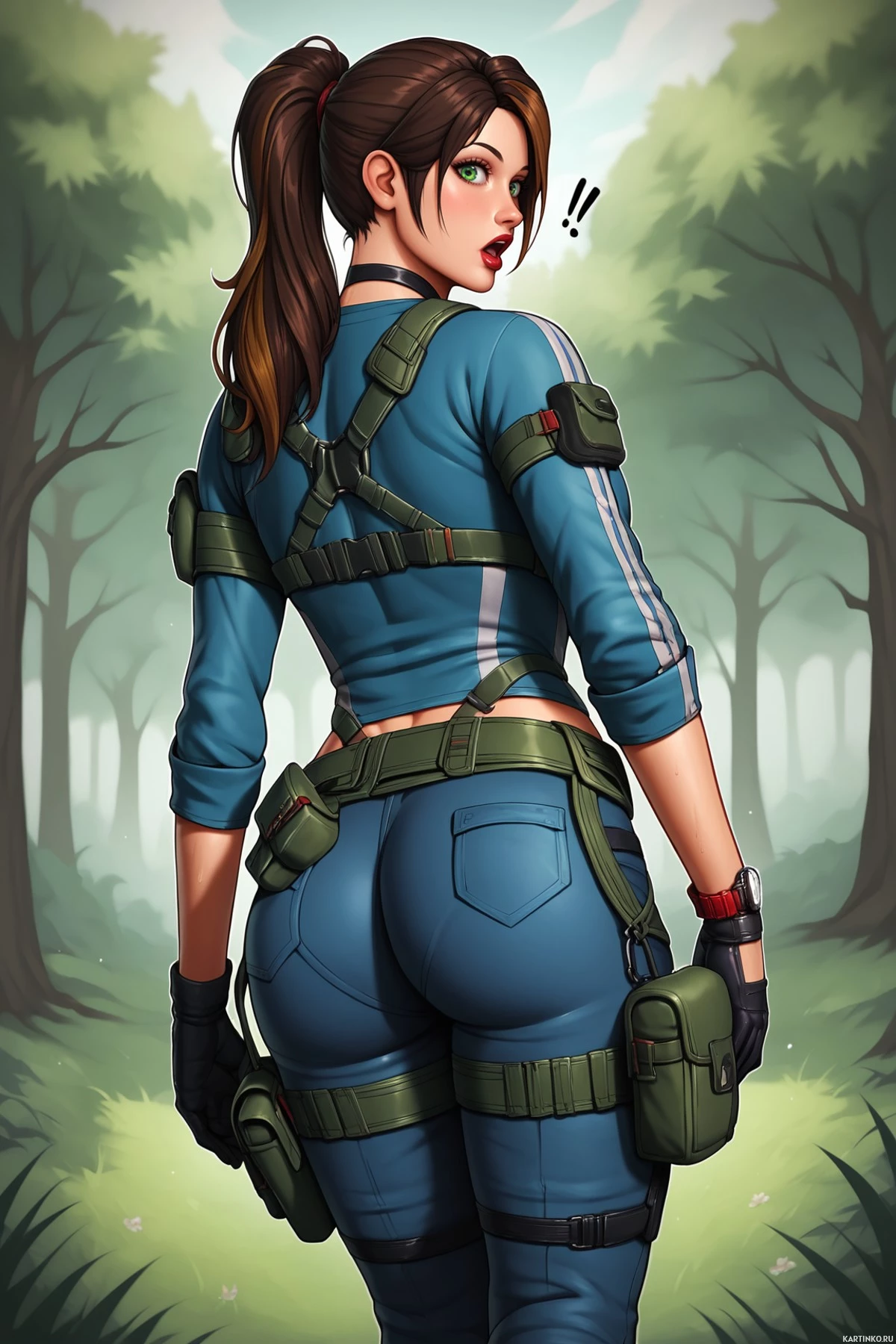 brown hair and is wearing a blue bodysuit with straps over her shoulders and across her back. The bodysuit also includes what appear to be