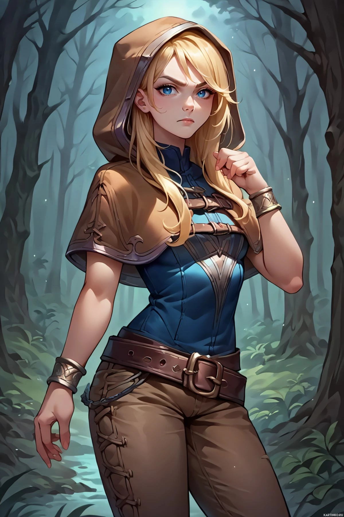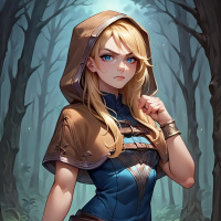 hooded cloak over a light-colored tunic, paired with leather pants. A sash across her chest suggests she might have some sort of authority or status within the context of the setting she is in. The character is standing amidst