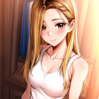 The image shows a young woman posing for a photo. She has blonde hair and is looking directly at the camera with a slight smile. Her outfit consists of a white tank top and denim shorts, suggesting a casual style. In the background, there appears to be a locker or storage area with various items stored inside, indicating that this could be a dressing room or similar setting. The woman is standing in front of a mirror, which reflects part of her outfit and the interior space behind her.