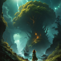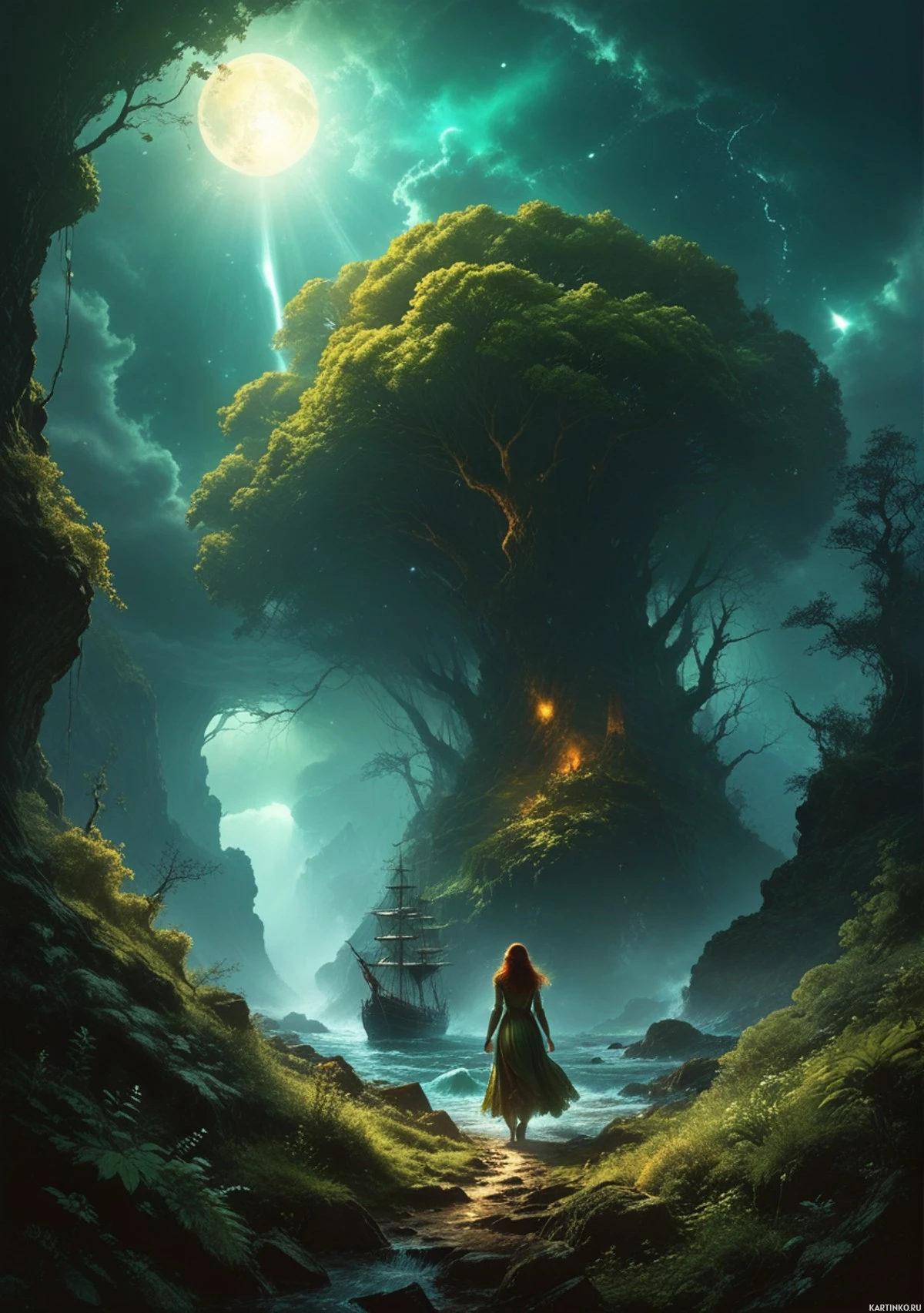 a fantastical scene with an illustrated girl who is standing on a path in front of a large tree. The tree has multiple branches and is situated amidst a landscape that includes rocky outcroppings, a small stream, and a ship visible in the distance on