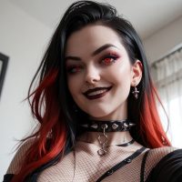 red hair and striking makeup, featuring dark lipstick and what appears to be red accents around the eyes. This individual is wearing
