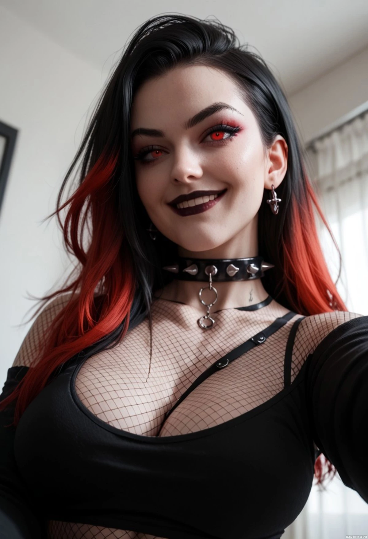 a black garment that has a sheer texture and is adorned with elements like chains and studs, which could suggest a style associated with emo or punk subcultures. The person is smiling directly at the camera, exuding confidence and personality.