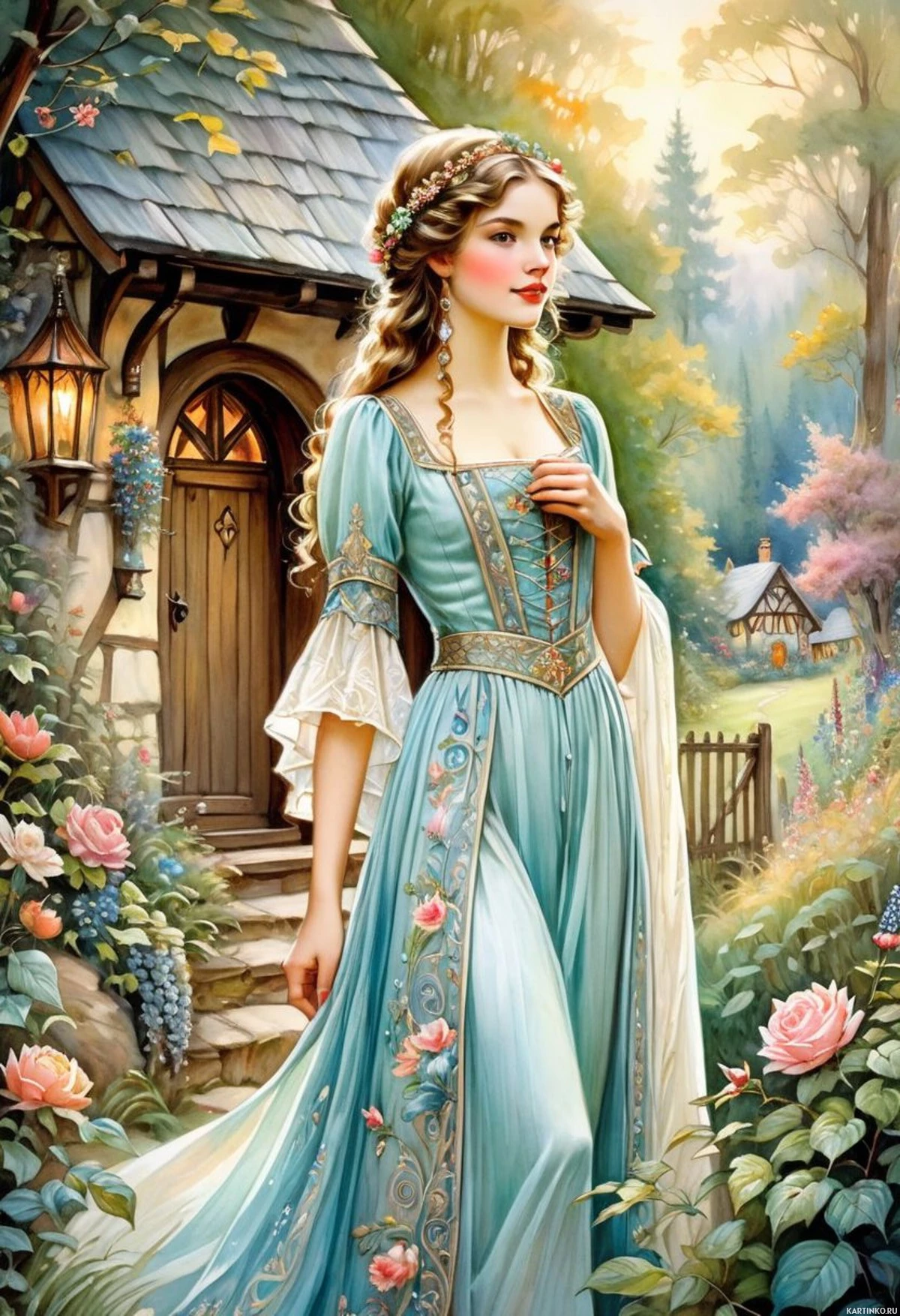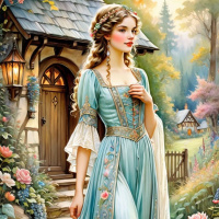 intricate designs. The setting includes a rustic cottage with a thatched roof, partially obscured by