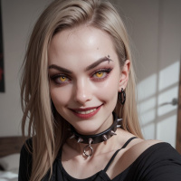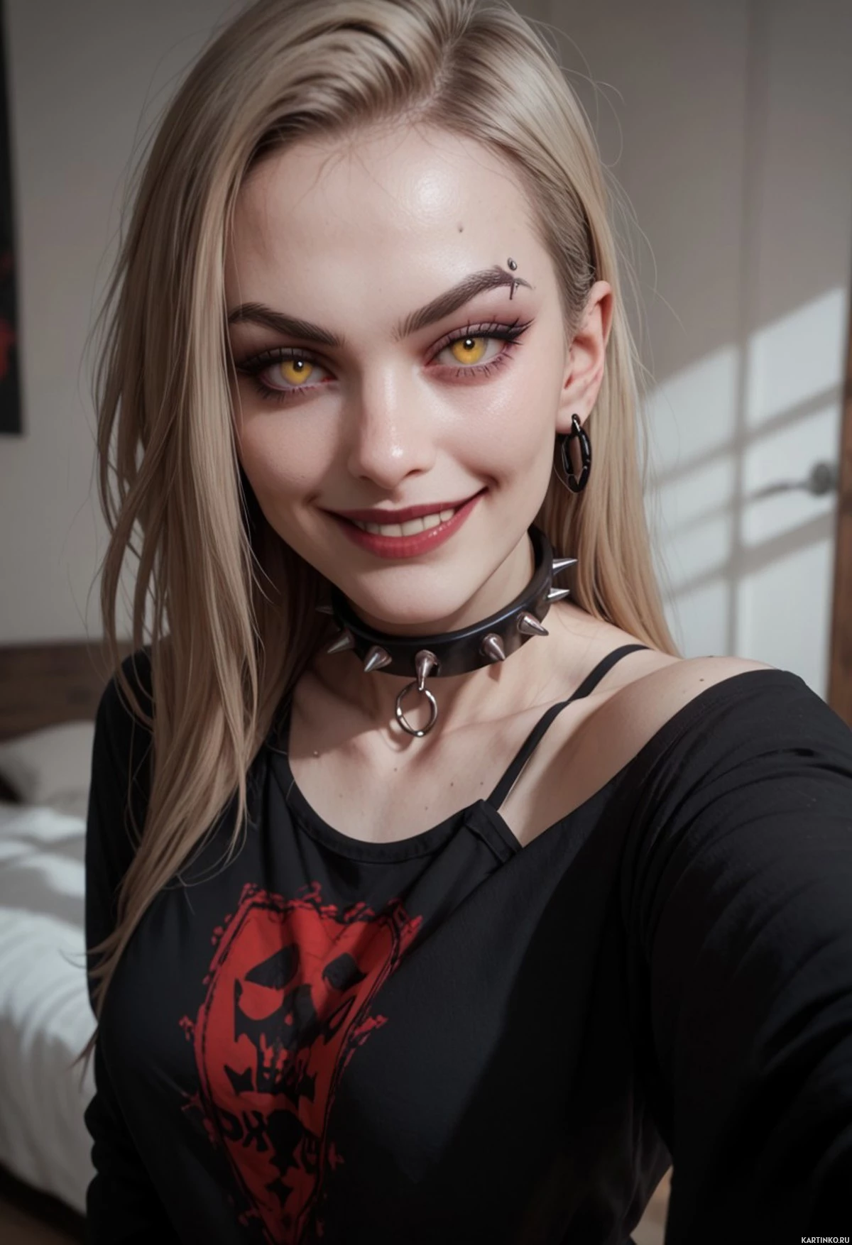 The image depicts a young woman with long blonde hair smiling at the camera. She has fair skin and is wearing a black top with a graphic on it, possibly resembling a skull or an emoji-like face. Her eyes are looking directly at the camera, giving off a casual yet confident vibe. The background suggests a domestic setting, possibly a room in a home or hotel.