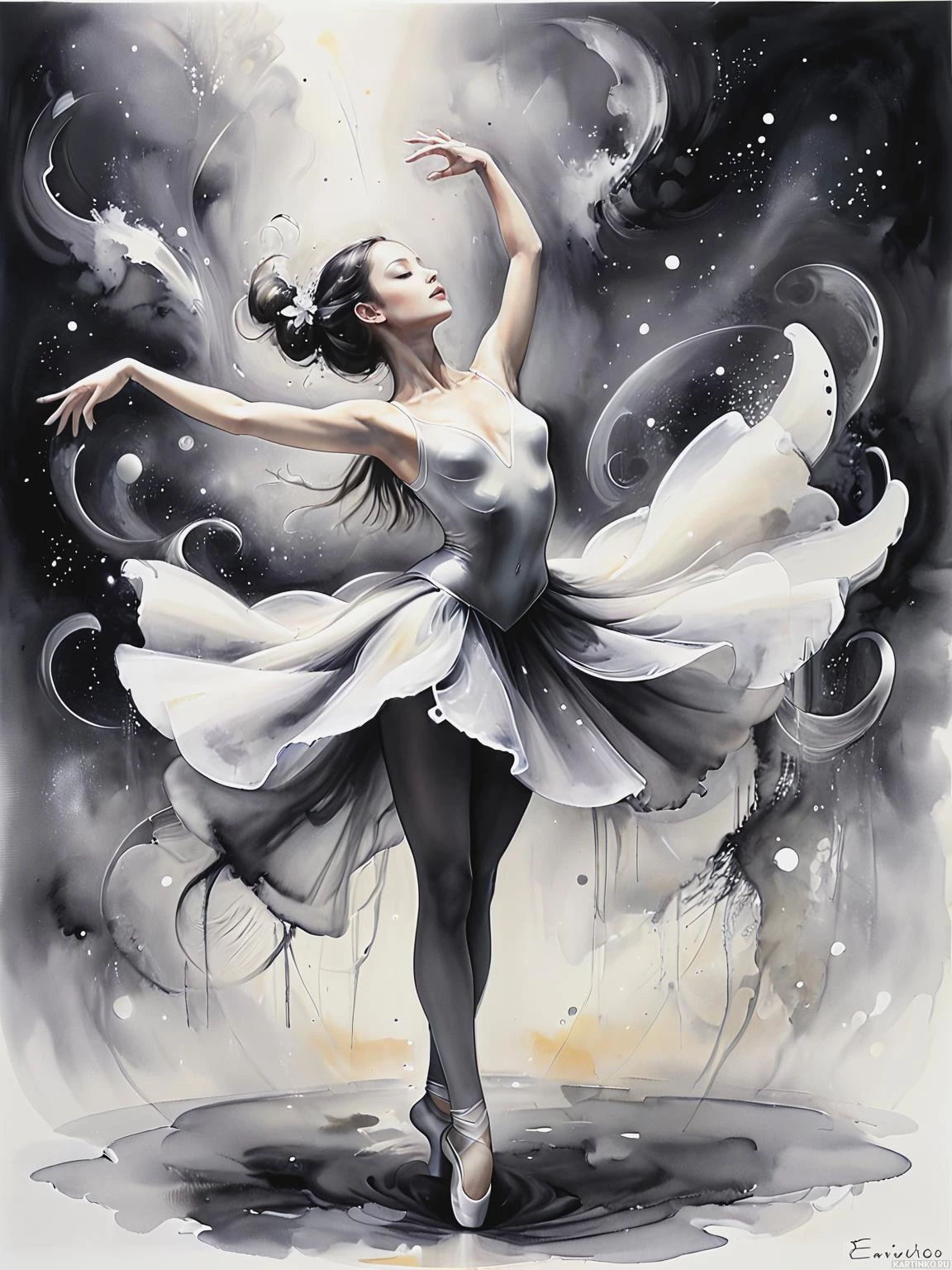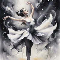 ballet attire, including a tutu that suggests she might be performing in a classical ballet setting. The background has an ethereal quality with swirling patterns and what seems like dark smoke or clouds, which contrasts with her poised demeanor, creating