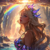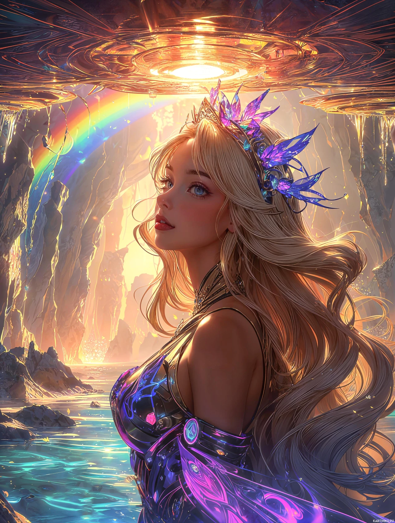 rock formations in the background, suggesting a storybook or otherworldly environment. There is a rainbow-like light emanating from above her head, adding to