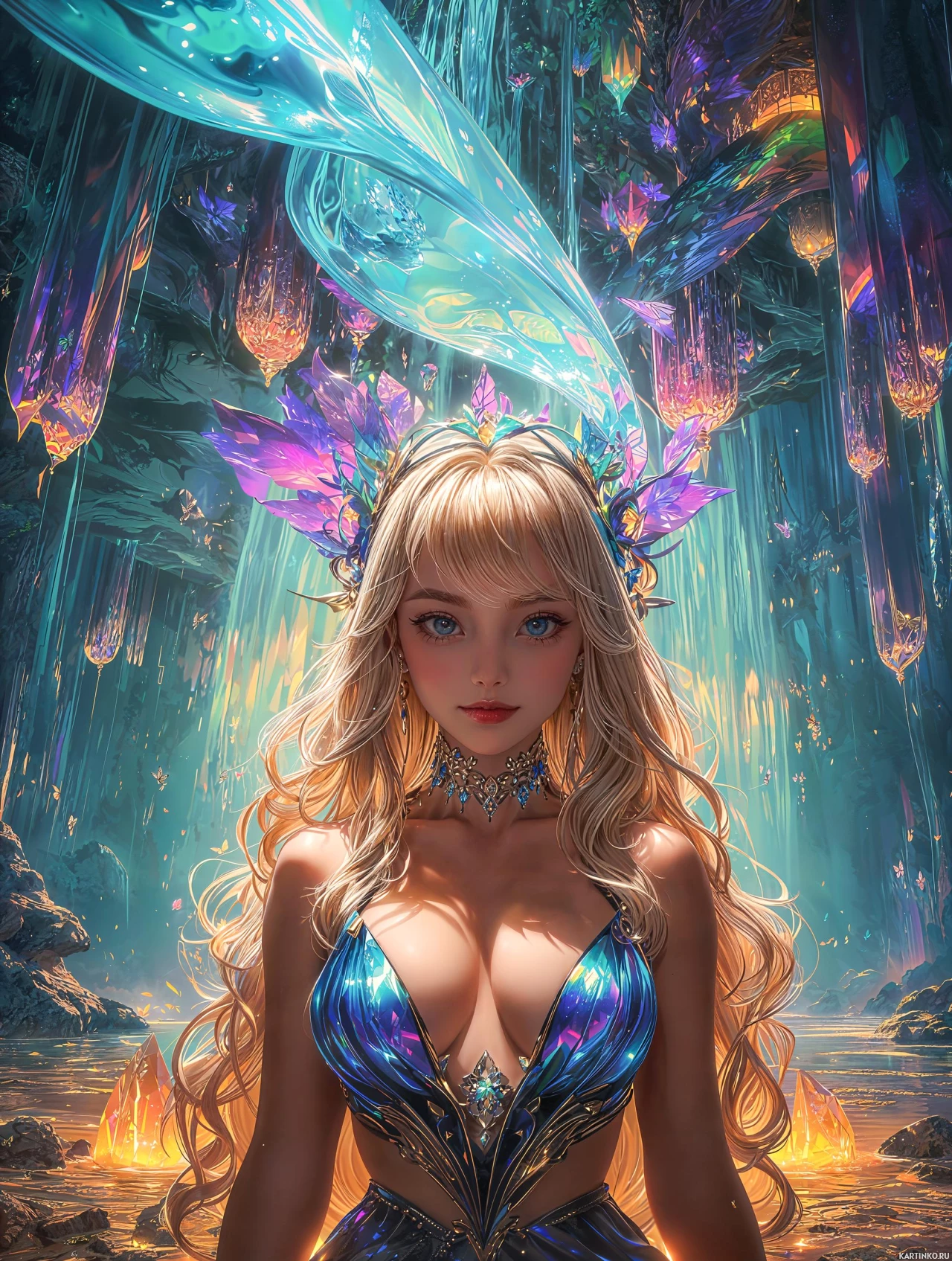 a shimmering top that appears to be made of scales or a material that sparkles like water. She wears a tiara-like headpiece with what looks like shells and feathers attached to it, adding to her aquatic theme. The background is fantastical, featuring
