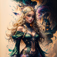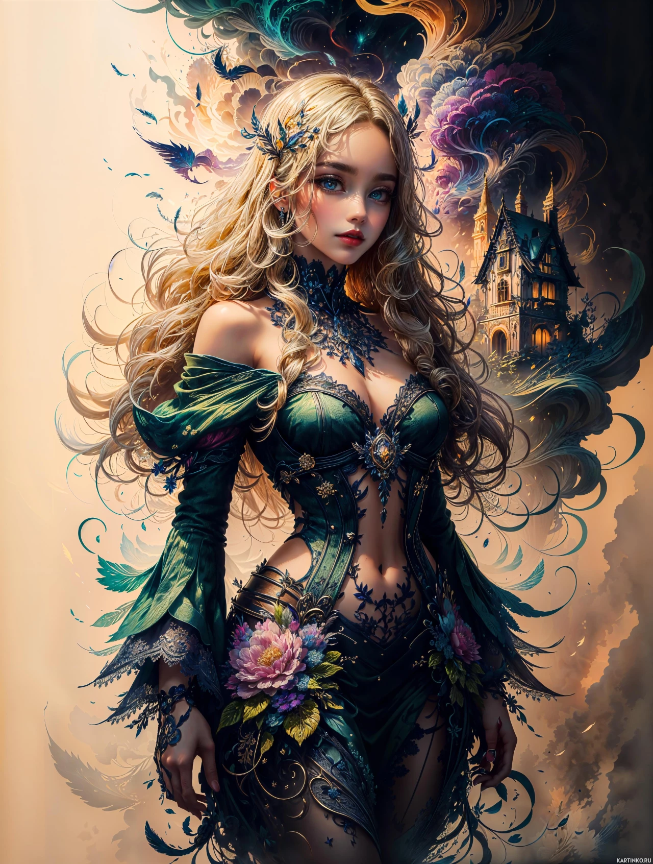 intricate designs, and she is adorned with flowers on the bodice. The background features