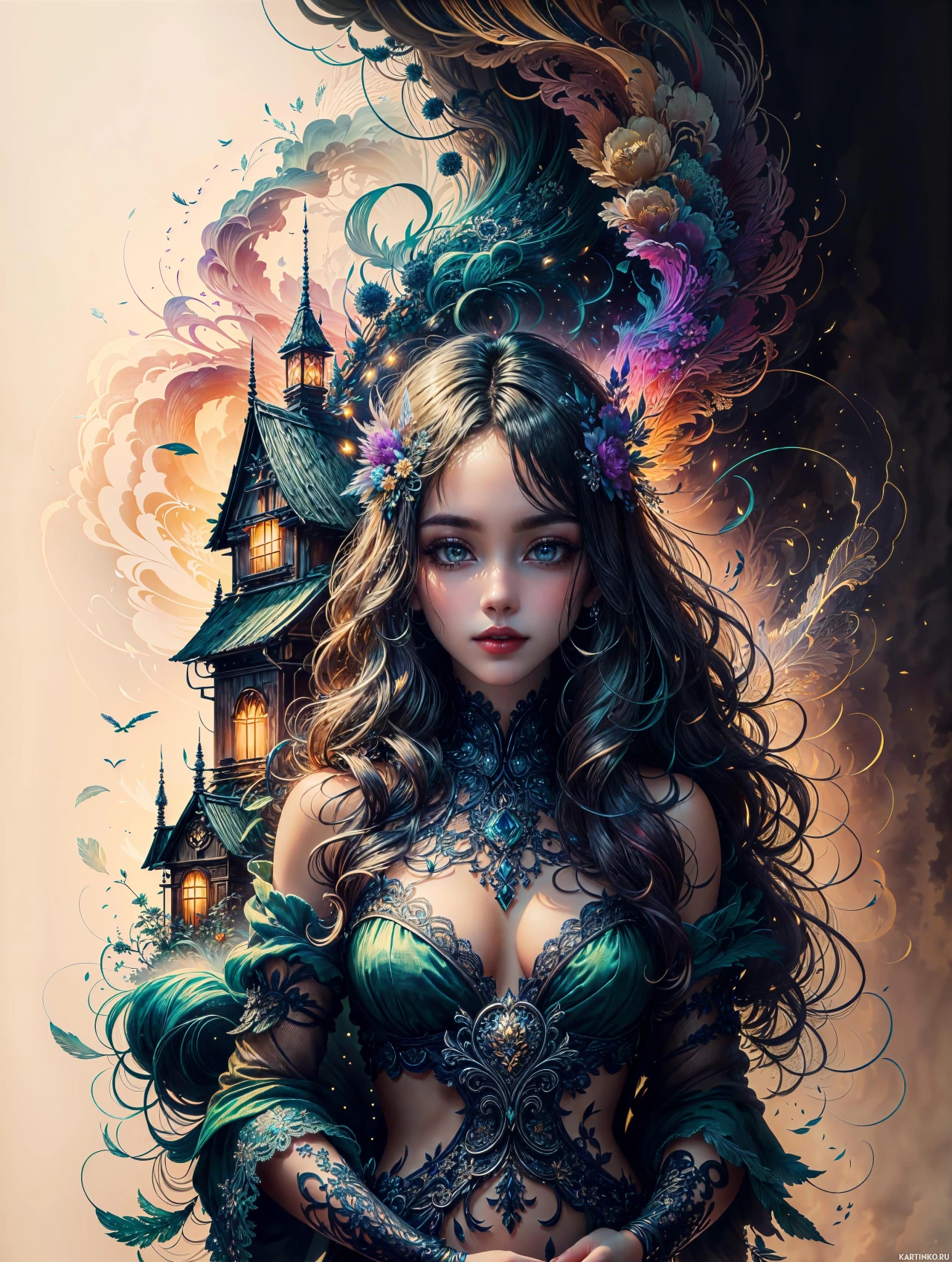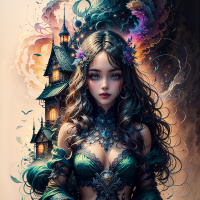 mystical figure. The artwork includes fantastical elements such as swirling flames or energy around her head and wings sprouting from her back. Her expression is serious and contemplative, and she gazes slightly to the side of the viewer. In the background, there are hints of a castle-like structure with multiple spires, adding to