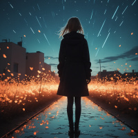 train tracks at night. The girl is looking off into the distance, and she seems to be in motion, as suggested by her