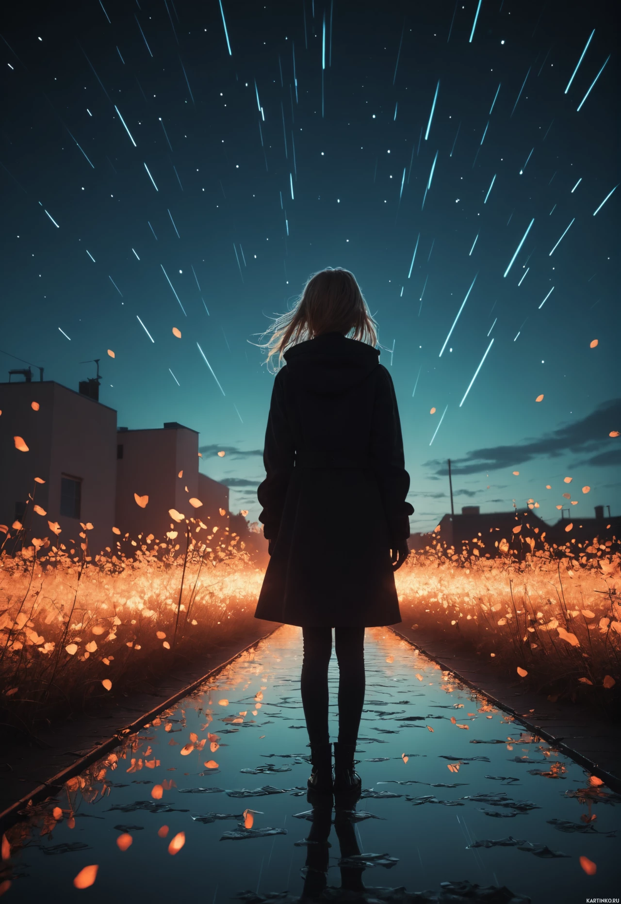 blurred figure. The sky above her is filled with stars, indicating it might be late evening or
