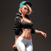 a confident pose with one hand on her hip and the other resting on the ground. The image is likely related to a digital artwork or illustration rather than a photograph of