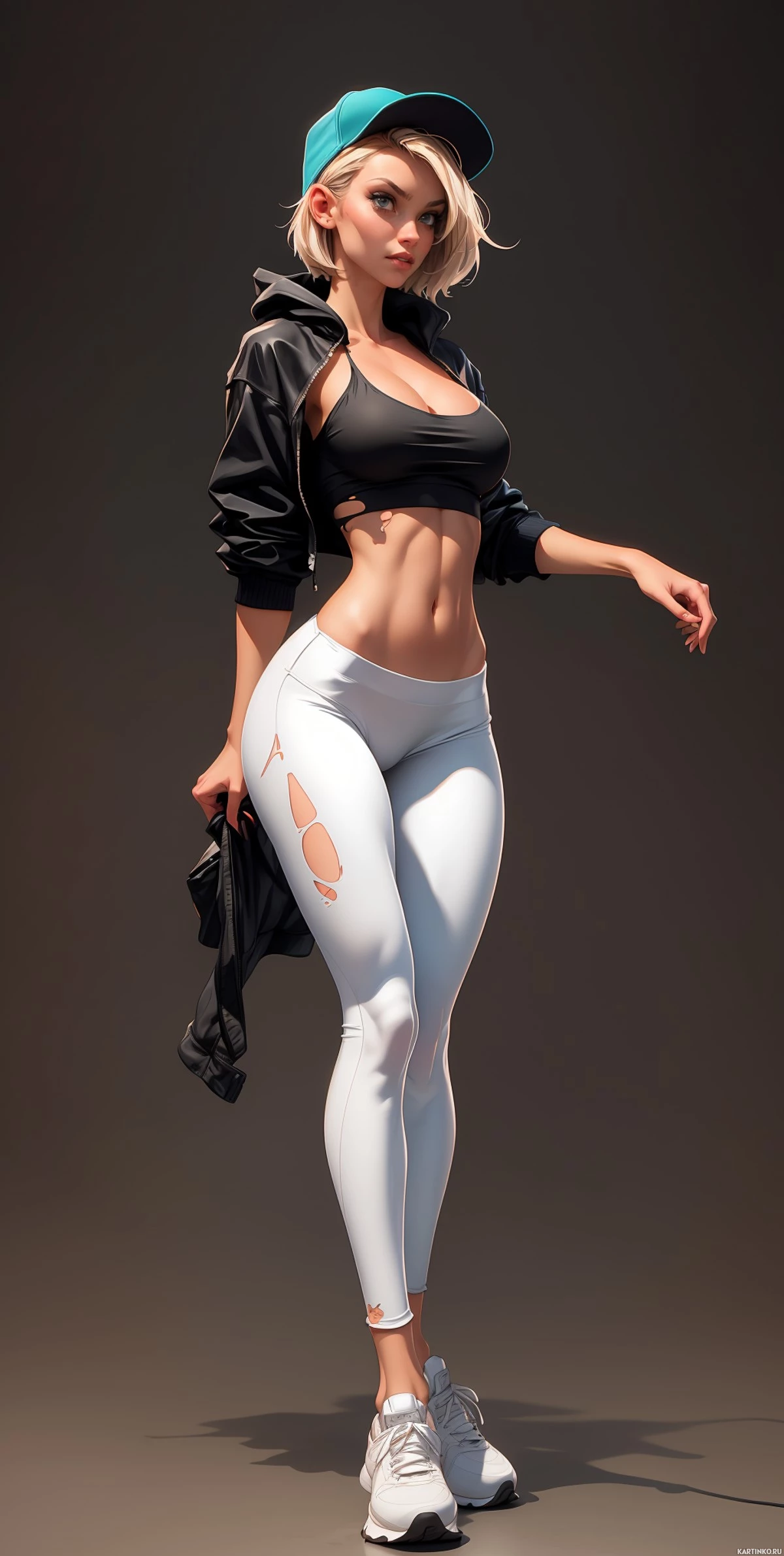 blonde hair and is wearing casual attire consisting of a light blue denim jacket over a black crop top. Her jeans are ripped at the knees, adding to the relaxed yet edgy look. She accessorizes with a baseball cap worn backward, white sneakers, and appears to be in