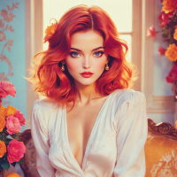 red hair, seated on what appears to be an elegant chair or bench. She is wearing a cream-colored dress that has