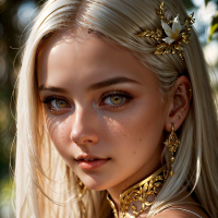 an elegant touch to her outfit. The background is softly blurred, but it suggests a natural setting with greenery and sunlight filtering through, indicating an outdoor location possibly during late afternoon or early evening when the lighting is warm and inviting. The focus on the woman's face and expression conveys a sense of calmness and introspection.