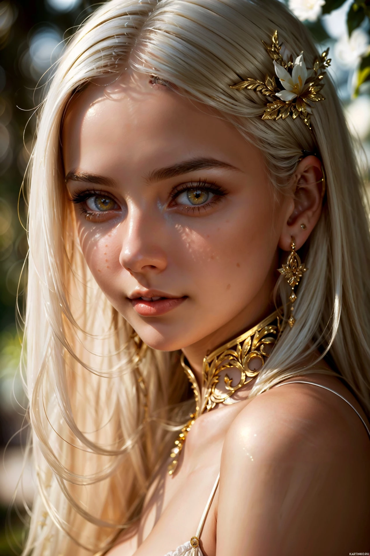 a young woman with white hair and a fair complexion. She has delicate facial features, including