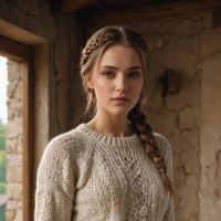In the image, a young woman is the central figure. She has long, straight hair with blonde highlights and her expression is neutral with a slight frown on her lips. Her eyes are directed off to the side, not meeting the camera's gaze directly. The woman is wearing a high-necked, lacey sweater in a cream or light beige color over a black top, paired with dark pants and black ankle boots. She is standing indoors, as suggested by the interior backdrop which includes wooden flooring and walls, and what appears to be shelving or storage units on one side. Natural light seems to be entering from the window to her right, casting a soft glow on her. The ambiance of the setting is quaint and somewhat rustic, indicating it could be an old building or a space designed to resemble such architecture.