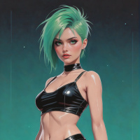 a female character with green hair. She is depicted wearing black